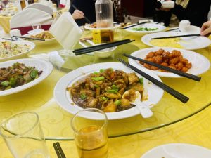 大皿に乗ったいわゆる円テーブルを囲んでの中華料理は、盛りだくさんで美味しかったです。